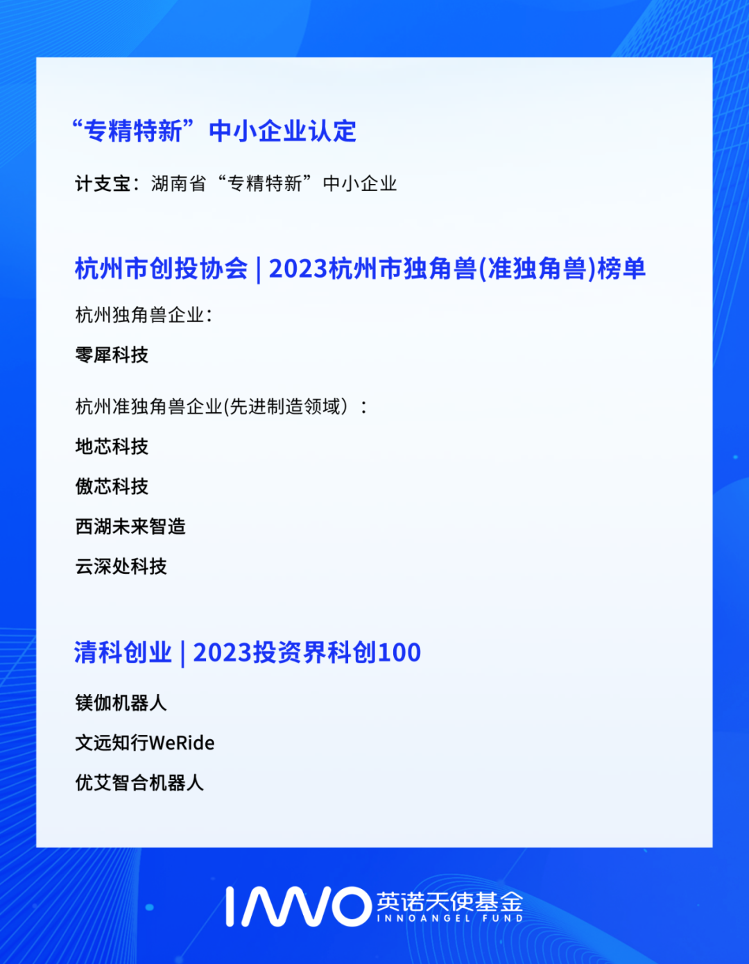 • 10+家企业稳中求进,取得新突破:天兵科技自主研发的天龙二号遥一运载火箭首飞成功;阿丘科技携三款新品迈进工业视觉AI2.0时代;本导基因VLP体内基因编辑疗法BD111注射液IND获批...• 10+家企业捷报频传,斩获行业荣誉:比昂芯科技入选芯榜EDA新锐创新TOP10;歌锐科技荣登毕马威中国第二届生物科技创新50企业榜;天兵科技荣获“商业航天最具商业价值企业奖”、“商业航天最具人气企业奖”...