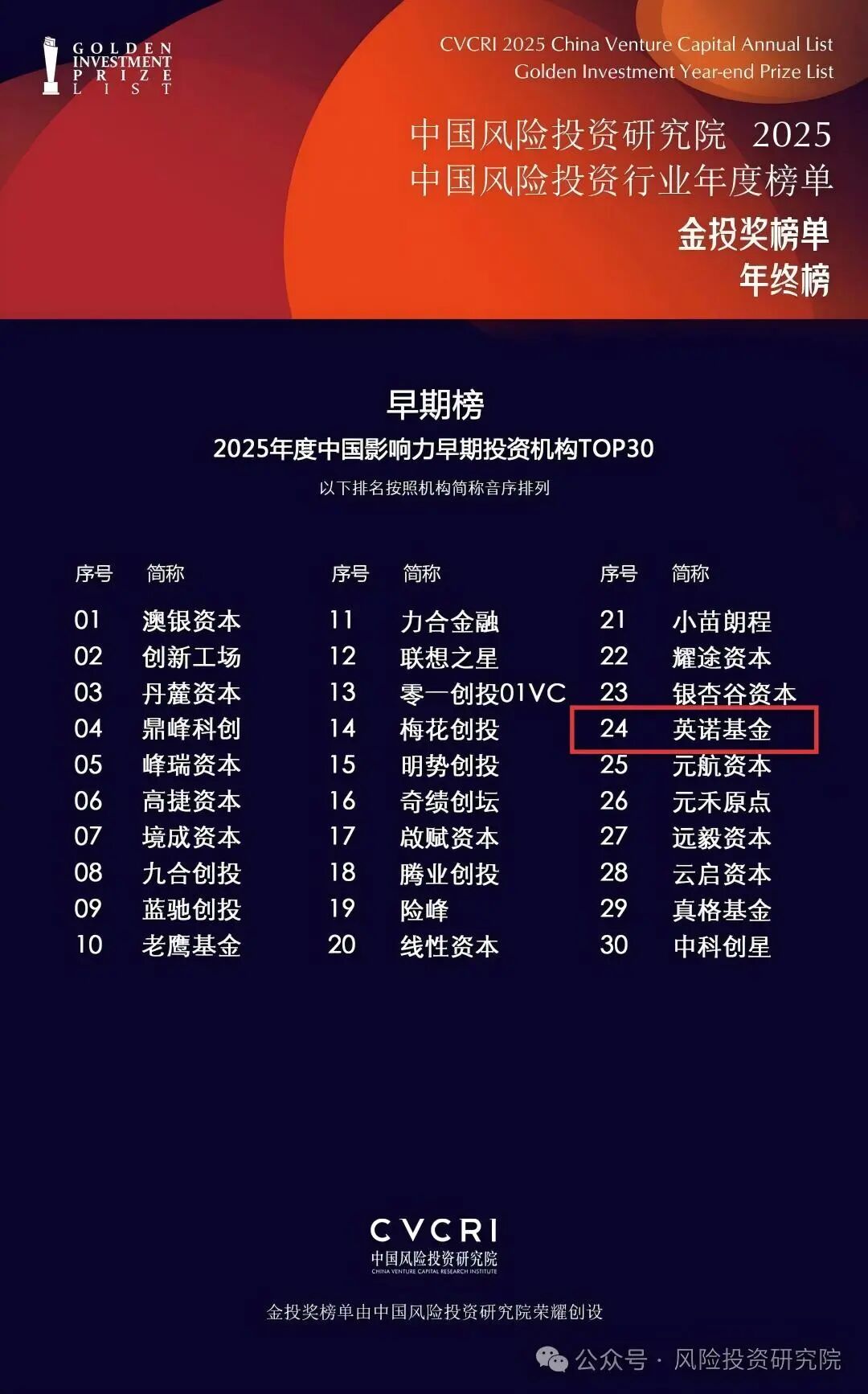 近日,好消息频传,英诺基金接连喜获多项荣誉认可,接下来与你一起分享:1月29日,中国风险投资研究院正式揭晓“2025中国风险投资行业年度榜单·金投奖榜单·年终榜”,英诺基金上榜「2025年度中国影响力早期投资机构TOP30」、英诺基金管理合伙人周全上榜「2025年度中国影响力早期投资家TOP20」。
