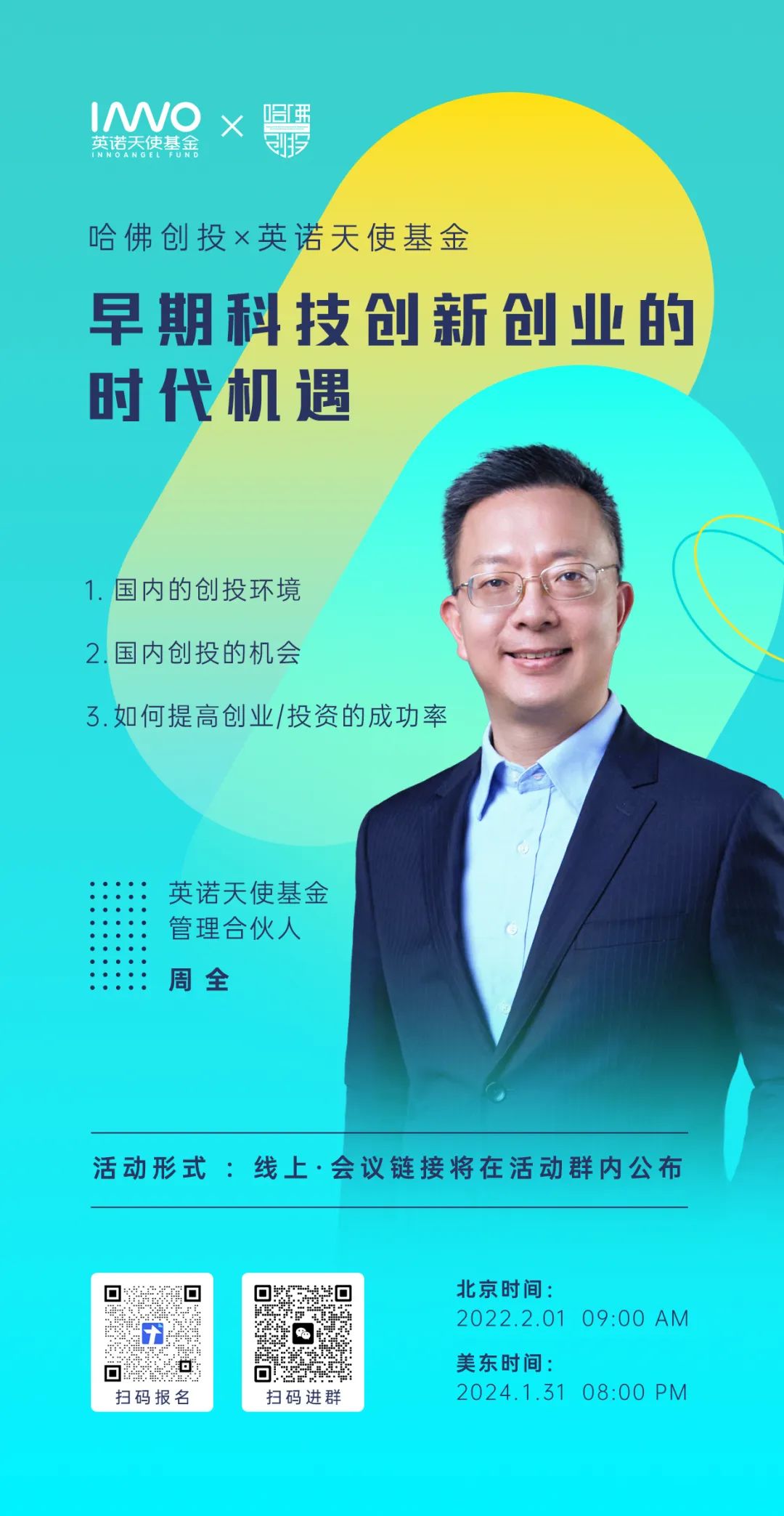如果你对最前沿的科技创新充满好奇,对极具挑战的创投行业心怀期待,来这里,我们将展开一场有问必答的深度碰撞。2月1日(美东时间1月31日晚),英诺天使基金联合哈佛创投俱乐部,将在线上举办一场主题为“早期科技创新创业的时代机遇”的分享会,邀请英诺天使基金管理合伙人周全为大家分享真实的国内创投市场,解读当下最新的创投机会,传授如何投出优秀项目的实战经验……分享会上,我们会同时开启2024小天使成长计划的海外站招募,该计划是由英诺天使基金于2016年发起的暑期实习活动,实习时间每年6月至8月,旨在帮助优秀的年轻人在心中播撒创投的种子,为创投行业的发展注入更多活力。不止于实习,小天使成长计划还设有“从0到1入门早期投资”的课程,6堂大课、18堂小课,从投资策略到实战技巧,全方位拆解早期投资。扫码报名?