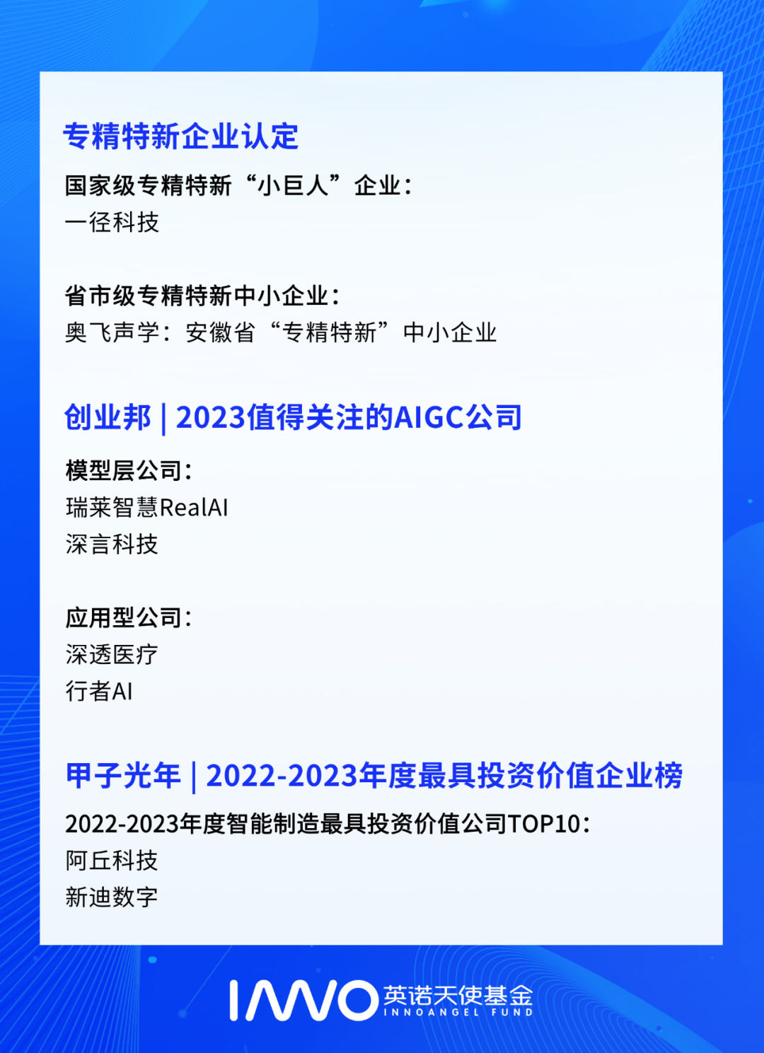 • 10+家企业捷报频传,斩获行业荣誉:深透医疗入选CB Insights公布的首届生成式人工智能50强榜单;歌锐科技荣登2023年度最具创新性医疗器械产品(解决方案)TOP100;云储新能源荣获HICOOL 2023全球创业大赛总决赛一等奖海外组第一名...